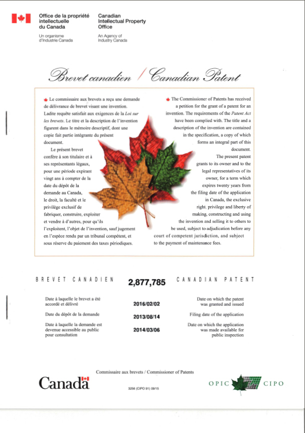 實(shí)德聚酯合金技術(shù)發(fā)明專利《自增強(qiáng)型塑料異型材及其生產(chǎn)方法》,獲得了加拿大專利局授予的第2877785號(hào)《發(fā)明專利證》。