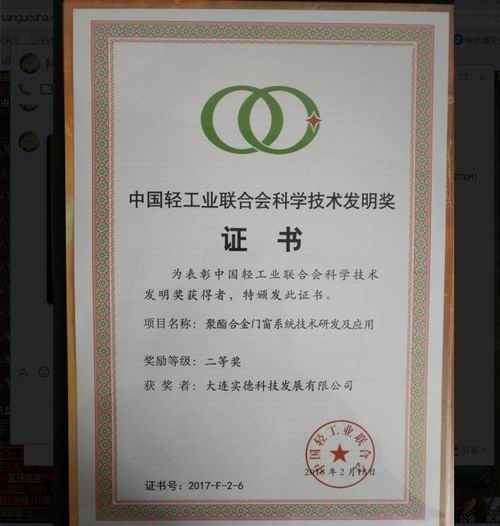 2018年3月20日,由實德科技研究院負責研發(fā)并組織申報的實德聚酯合金門窗系統(tǒng)技術獲得了中國輕工業(yè)聯(lián)合會科學技術發(fā)明獎二等獎。