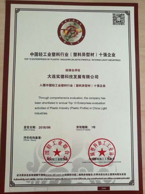 經(jīng)行業(yè)協(xié)會領(lǐng)導(dǎo)及專家審查,實(shí)德科技公司被評定為“2018-2019年度中國輕工業(yè)(塑料異型材)十強(qiáng)企業(yè)”。