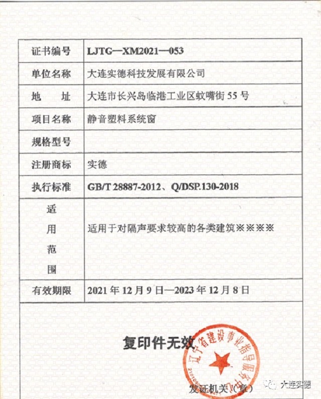 由實(shí)德研究院研制并組織申報(bào)的實(shí)德靜音系統(tǒng)窗產(chǎn)品和技術(shù),經(jīng)遼寧省住建廳主管部門和專家的審核評(píng)定,于2021年12月榮獲《遼寧省綠色建筑技術(shù)與產(chǎn)品推廣應(yīng)用證書》。